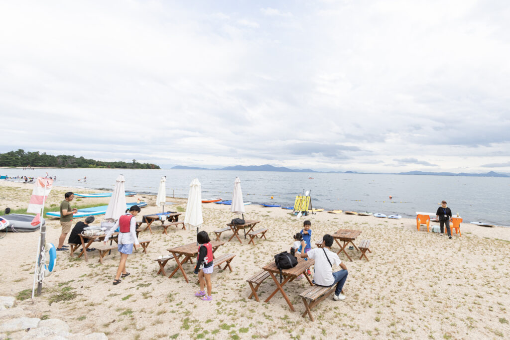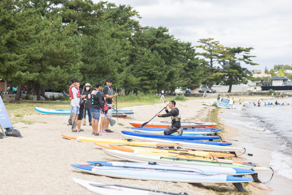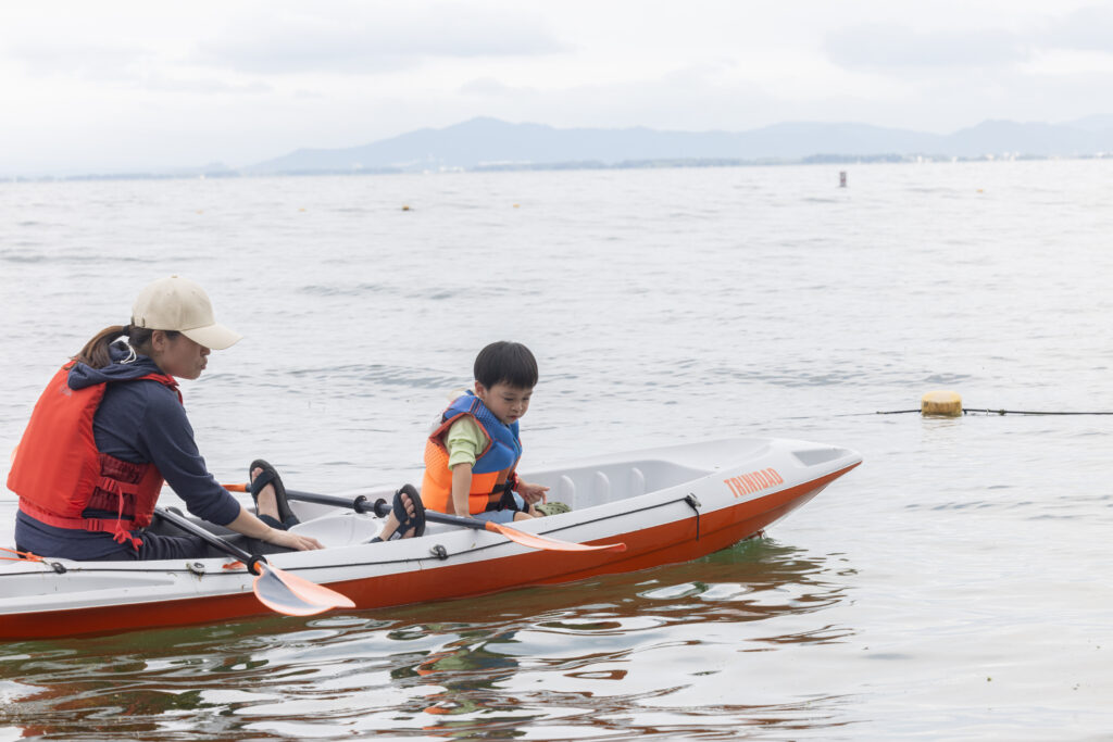 びわ湖の美しさを間近で見られる水泳場。当日はネイチャービンゴカードで身近な生き物や草花を探す体験あり、レイクアクティビティ「SUP&カヤック体験」が大盛り上がりでした。