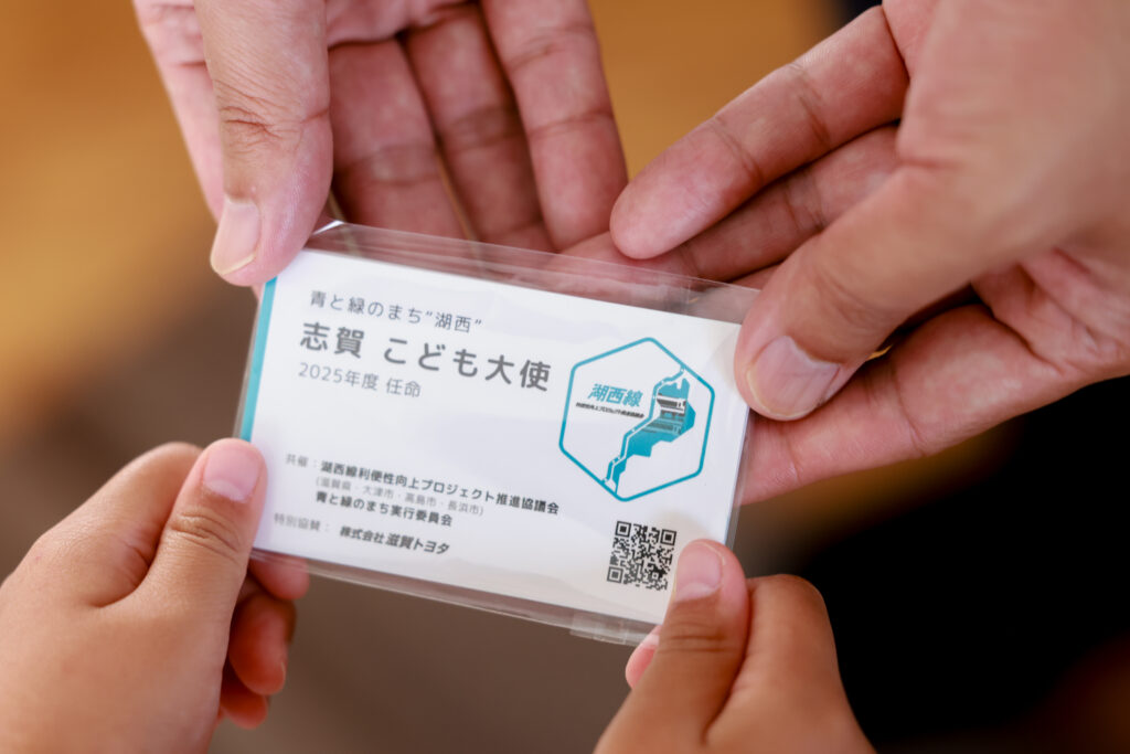 | ~16:00 | JR湖西線「志賀駅」へ戻ってきて、視察レポートを提出してね。 お礼に、「子ども大使 特製名刺」をプレゼントするよ。 明日からは大使として、このまちの魅力を友達に伝えよう! |